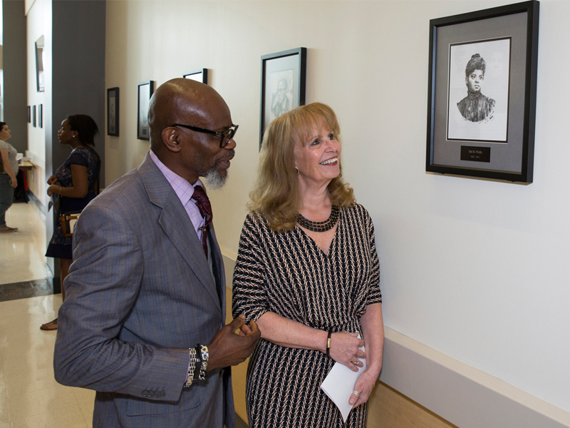 Middlesex County College alumnus Richmond Garrick ’96 recently donated 13 portraits of noted black historical figures to the College. The 13 were part of a large exhibit of his work during Black History Month in February. The artist, a teacher at Williamstown High School in Monroe and a native of Sierra Leone, displayed his work that included vivid scenes of his native land, including during its civil war. The portraits included Martin Luther King Jr., Rosa Parks, Duke Ellington and Ray Charles. He is shown here speaking about his portrait of Ida B. Wells with Charlotte Quigley, MCC’s manager of career services. The portraits will hang in West Hall, the College’s new enrollment services building.