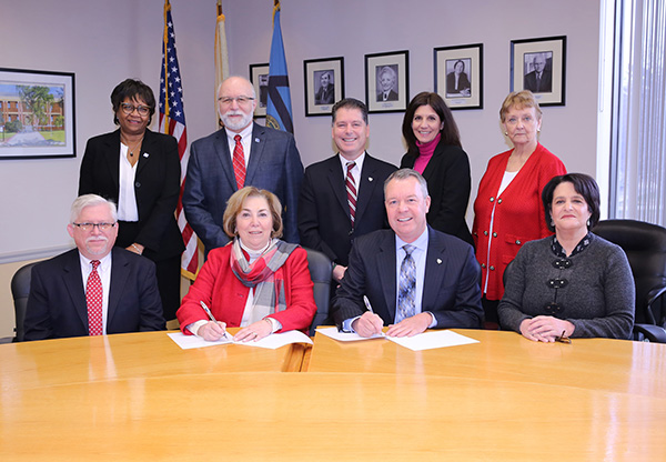 This initiative provides East Brunswick High School students the opportunity to earn an Associate Degree by taking college courses while still in high school. At present, more than 450 East Brunswick High School students have registered for 40 classes. Courses include mathematics, English, public speaking, accounting, computer science, natural sciences, history, political science and psychology, and world languages. At the signing, seated from left: Mark McCormick, MCC’s vice president for academic and student affairs; Joann La Perla-Morales, College president; Victor Valeski, East Brunswick superintendent; and Vicki Becker, vice president of the Board of Education. Standing: Marla Brinson, MCC’s dean of student affairs; Patrick Madama, vice president for institutional advancement; Michael Vinella, East Brunswick High School principal; Deborah Gulick, director of curriculum; and Evelyn Ogden, assistant superintendent.