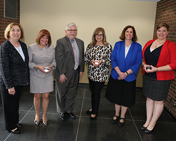 Pictured in the photo from left: College President Joann La Perla-Morales; Shirley Wachtel, Faculty Scholar Award winner; Vice President Mark McCormick; Kathy Shay, Teaching Excellence Award winner; Linda Scherr, dean of Arts and Sciences; and Sara Blomquist, Excellence in Teaching Part-Time Award winner.