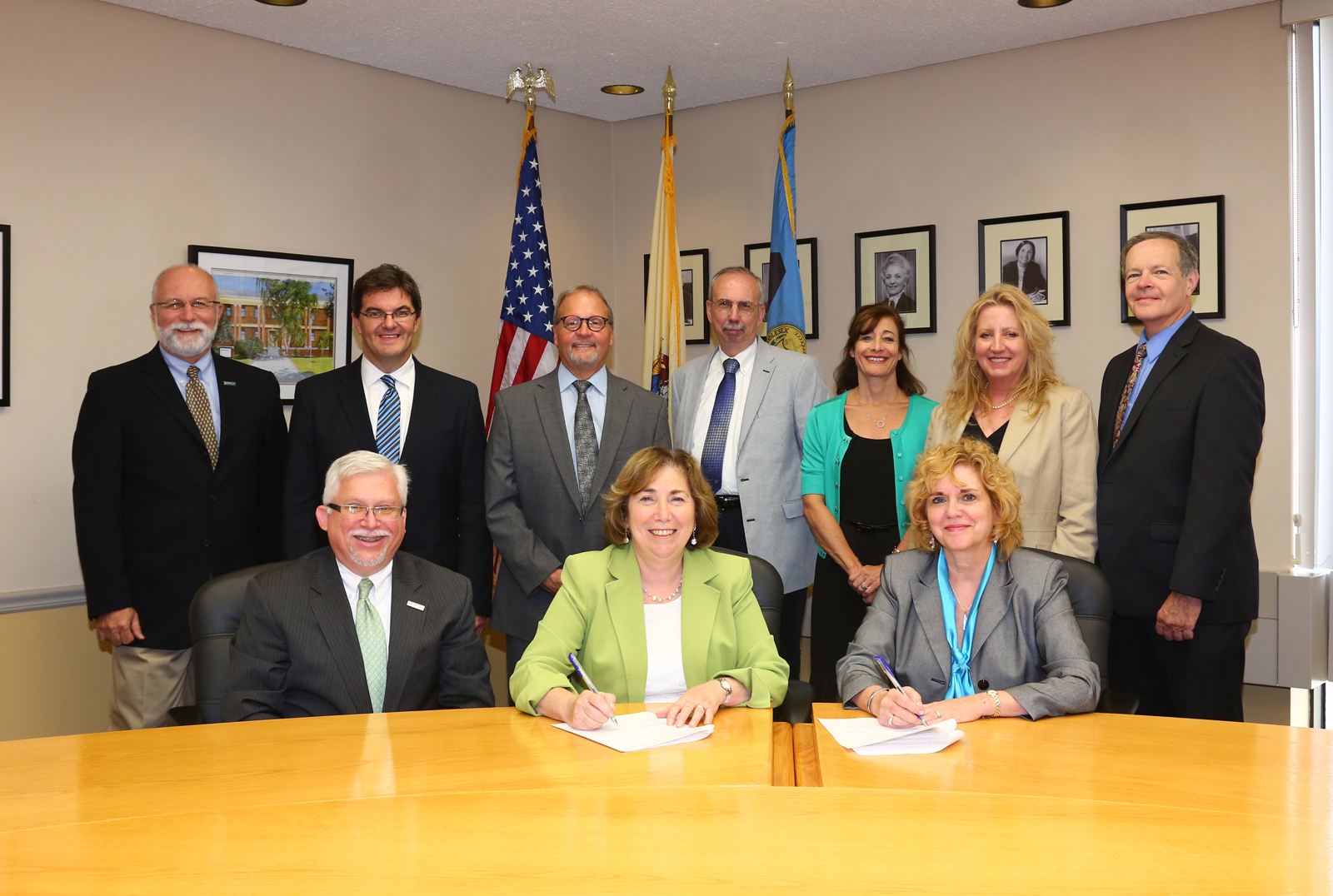 Seated, from left: Mark McCormick, MCC’s vice president for academic and student affairs; Joann La Perla-Morales, MCC’s president, and Barbara-Jayne Lewthwaite, Centenary College president. Standing, from left: MCC’s Patrick Madama, vice president for Institutional Advancement; Jeffrey Herron, dean of Professional Studies; and David Edwards, dean of Arts and Sciences; and from Centenary, Joseph Linskey, dean for the School of International Programs; Deirdre Letson, dean of the School of Professional Studies and director of Graduate Studies; Cheryl Veronda, associate professor of Business and chair of the Business Department; and Frank Longo, assistant professor, School of Professional Studies.
