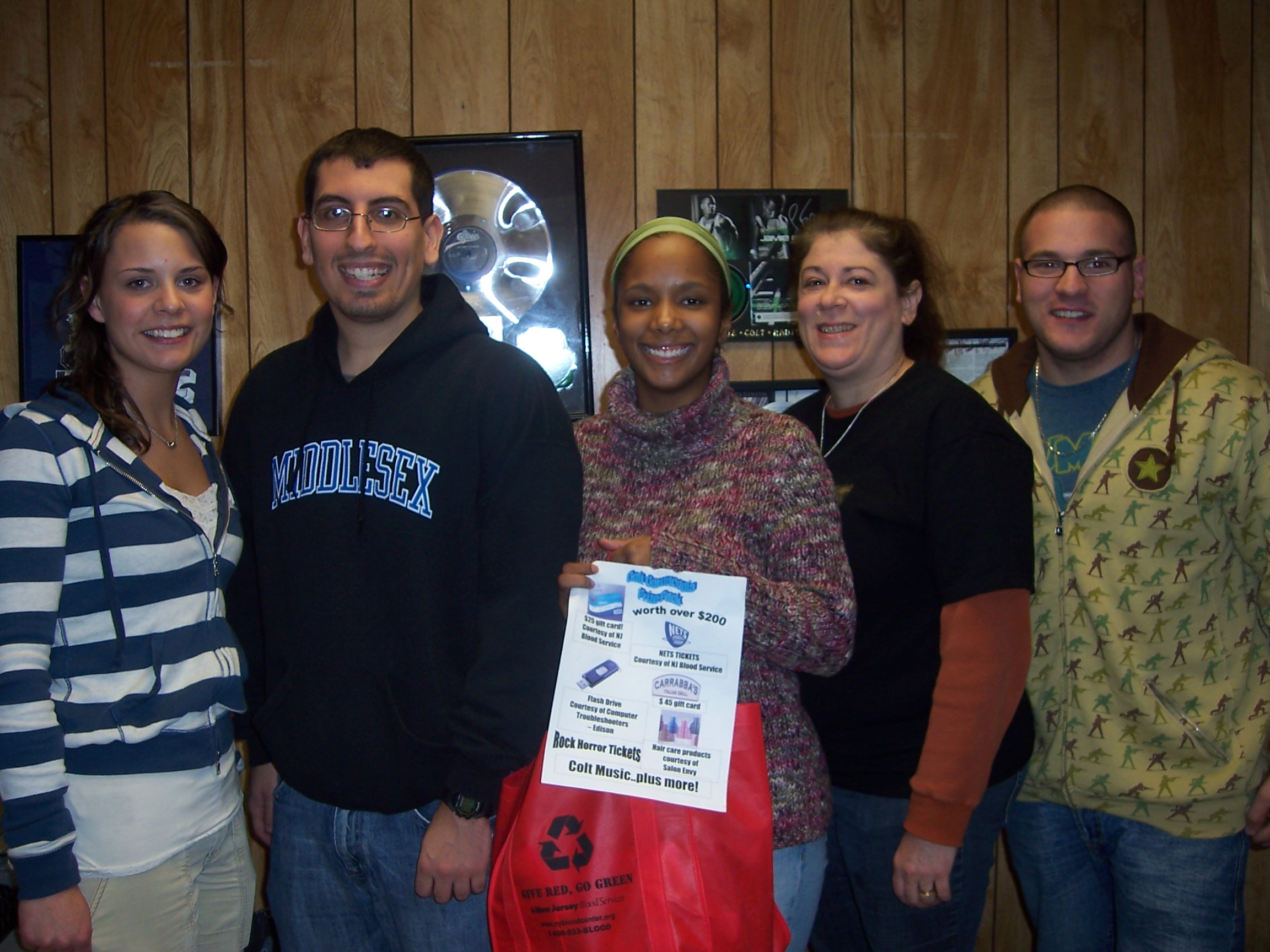 Blue Colt Radio teamed up with Democracy House for the Colt Clothing Drive, where we collected scarves, hats, gloves and other articles of clothing. The table event featured a Colt Prize Pack worth over $100.00. Joanna Martin (center) was our contest winner. She is photographed with our Colt Staff, (from left) Pat, Tom, Amy and Vito. People really do win radio contests!