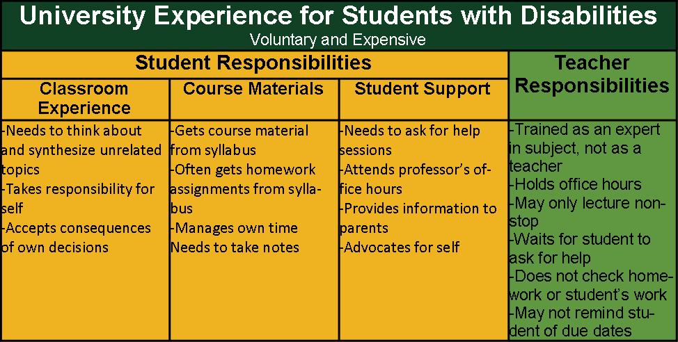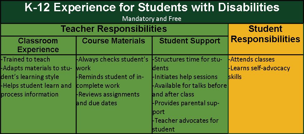 The legal force that guides our work on the Collegiate level varies greatly from the regulations that govern public elementary and secondary education. Many students with disabilities attending college come to us having been classified by the public school system through a child study team. The K to12 system has a vastly different set of rules that govern their elementary and secondary education. At times, the history of “entitlement” is projected onto college personnel and the differences in the requirements of the laws of the two educational systems may create confusion and communication gaps.