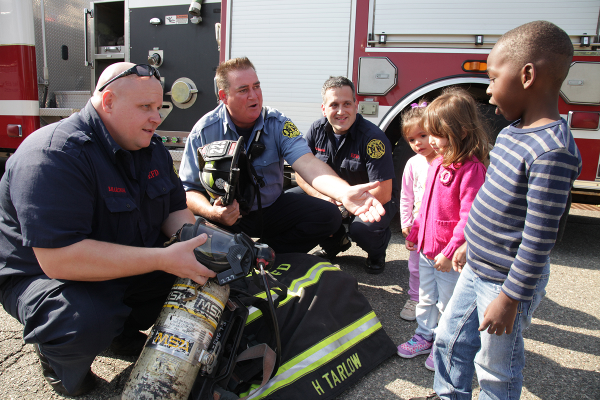 Health and Safety Day at Middlesex County College brought dozens of human service and safety agencies to campus to help students, faculty and staff learn about how to make their lives healthier. The day included a visit by the children in the College Child Care Center, who learned about fire safety from the Edison Fire Department. From left: Edison Firefighter Brad Marciniak, Captain Anthony Landi, Firefighter Howard Tarlow with Sara Shaughnessy, Mia Izurieta and Isaiah Penny.