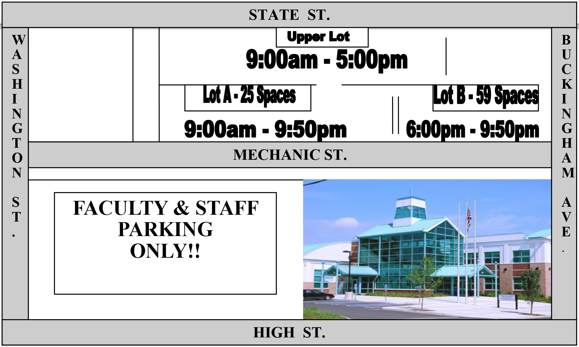 Evening Students – If you are attending a class that begins during the hours of 6:00pm to 9:50pm, you are allowed to park in the following areas: