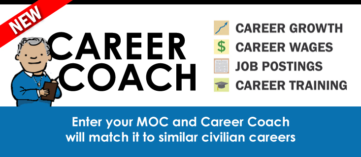 My Next Move allows you to search careers by keyword or your military classification code. You can browse careers by industry.