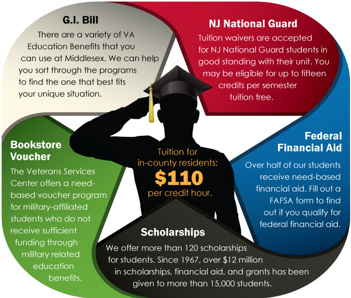 Middlesex County College accepts many military-sponsored education benefits. This section provides information and resources to help you apply for and manage your education benefits. We also offer scholarships, financial aid, payment plans, and other forms of aid to offset the cost of school. For more information about education benefits not related to military service, contact the Office of Financial Aid at 732.906.2520.
